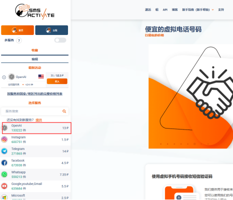 支付0.5-1美元即可满足购买虚拟手机号的需求,购买成功后返回首页,点击OpenAI进行虚拟手机号的国家选择