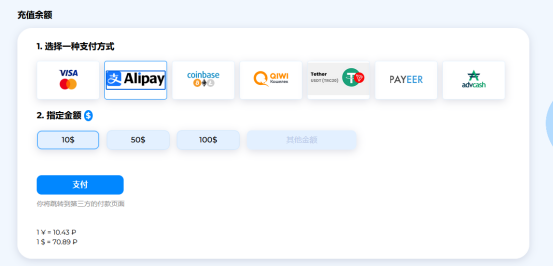 平台的页面整洁度很高,操作方便,充值也可以使用支付宝,缺点是只能固定金额,以及充值步骤相对于第一个平台来说有些复杂