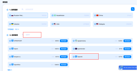 充值完成后返回首页,选择服务里输入OPEN即可看到OpenAI,再选择国家进行购买